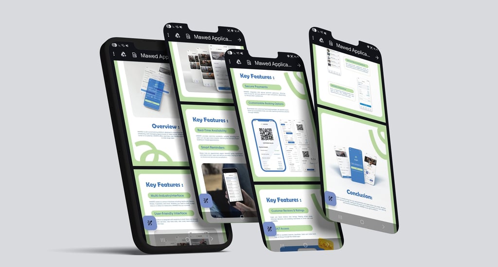 This was a file explaining the features, uses, and importance of a phone application called Mawid, which exists in Kuwait and allows you to book appointments anywhere without having to go there. Rather, you can book wherever you are. I used the application’s identity, approved colors, artistic shapes, coordination, and arrangement.